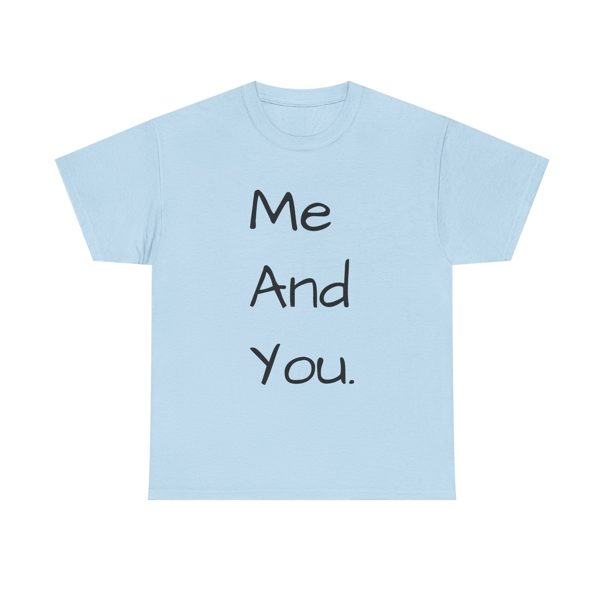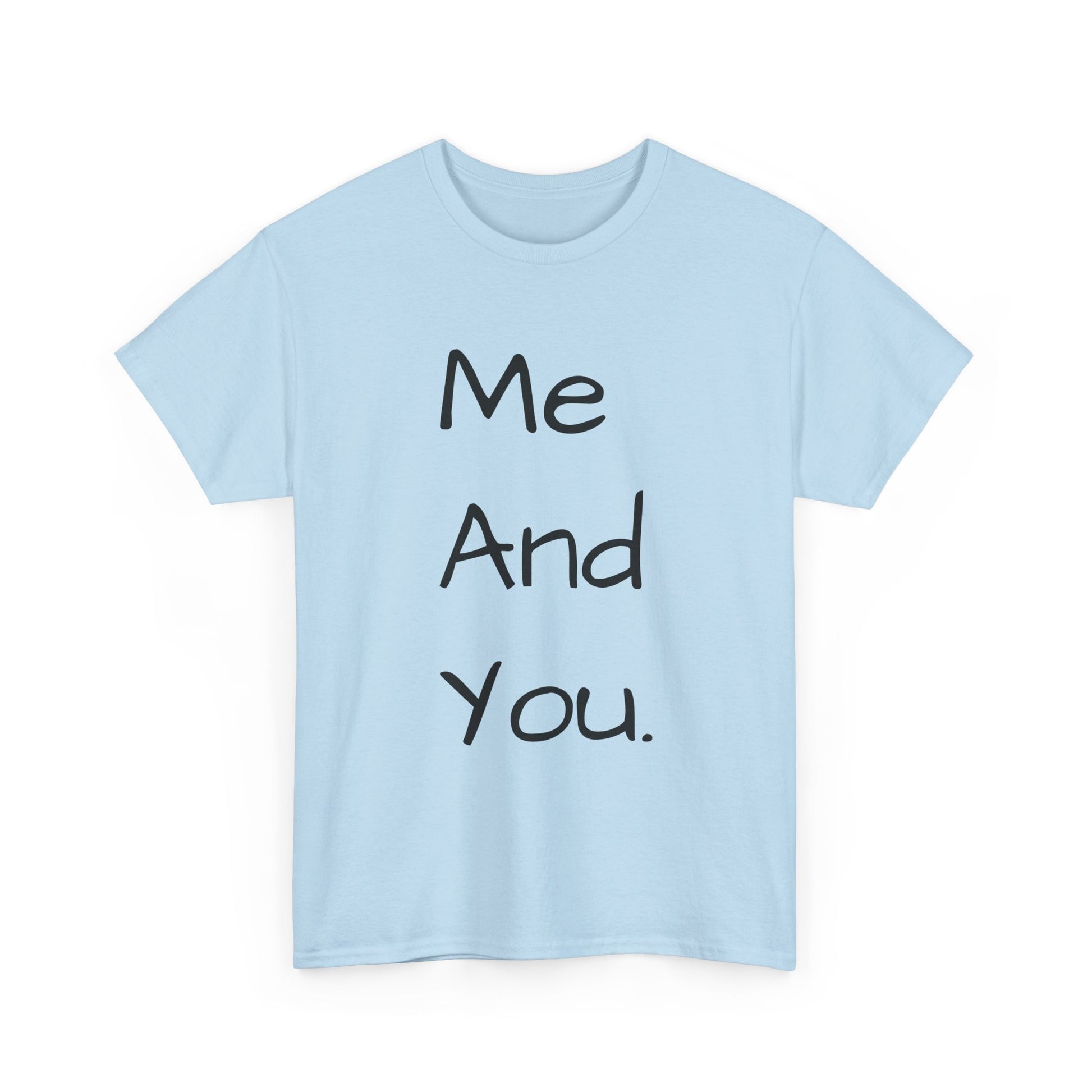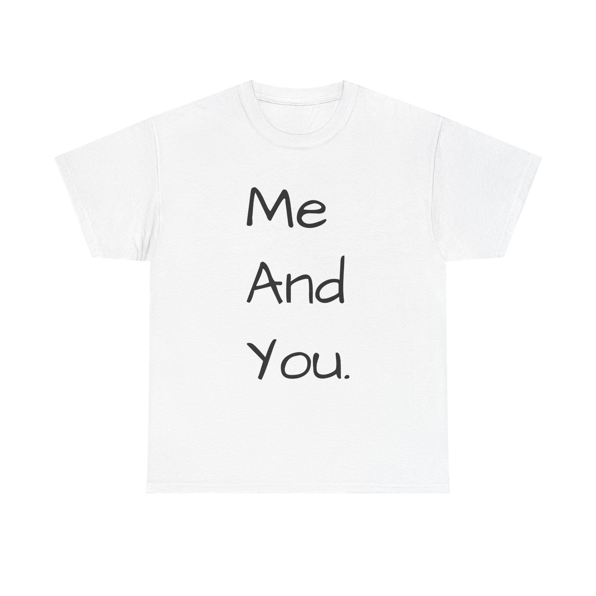 A soft, classic cotton tee with a quiet, handwritten message down the front: “Me And You.” The simple vertical text reads like a personal note, carrying warmth without shouting. Wear it on slow mornings with coffee and a partner, on casual date nights, or while wandering familiar streets. The light fabric and relaxed crew neckline sit comfortably—this is a shirt that settles into everyday life and keeps the focus on connection rather than flash. The subtle natural texture in lighter tones and clean white background make the words feel intimate and honest, a small wearable reminder of companionship.