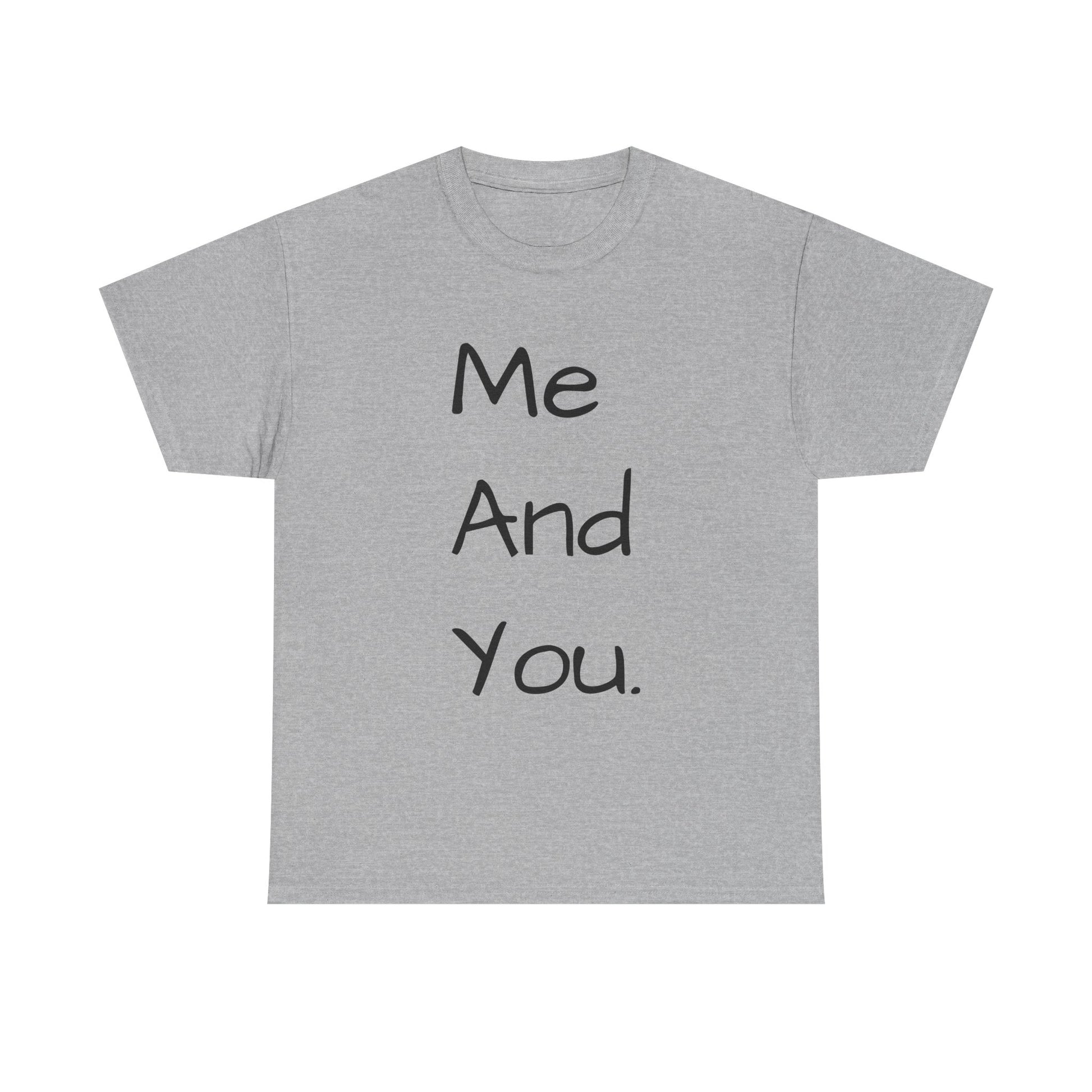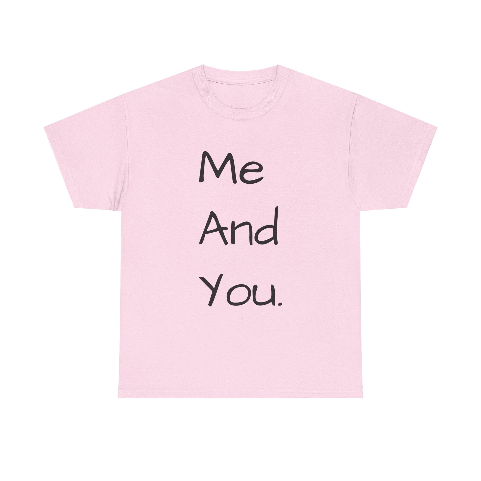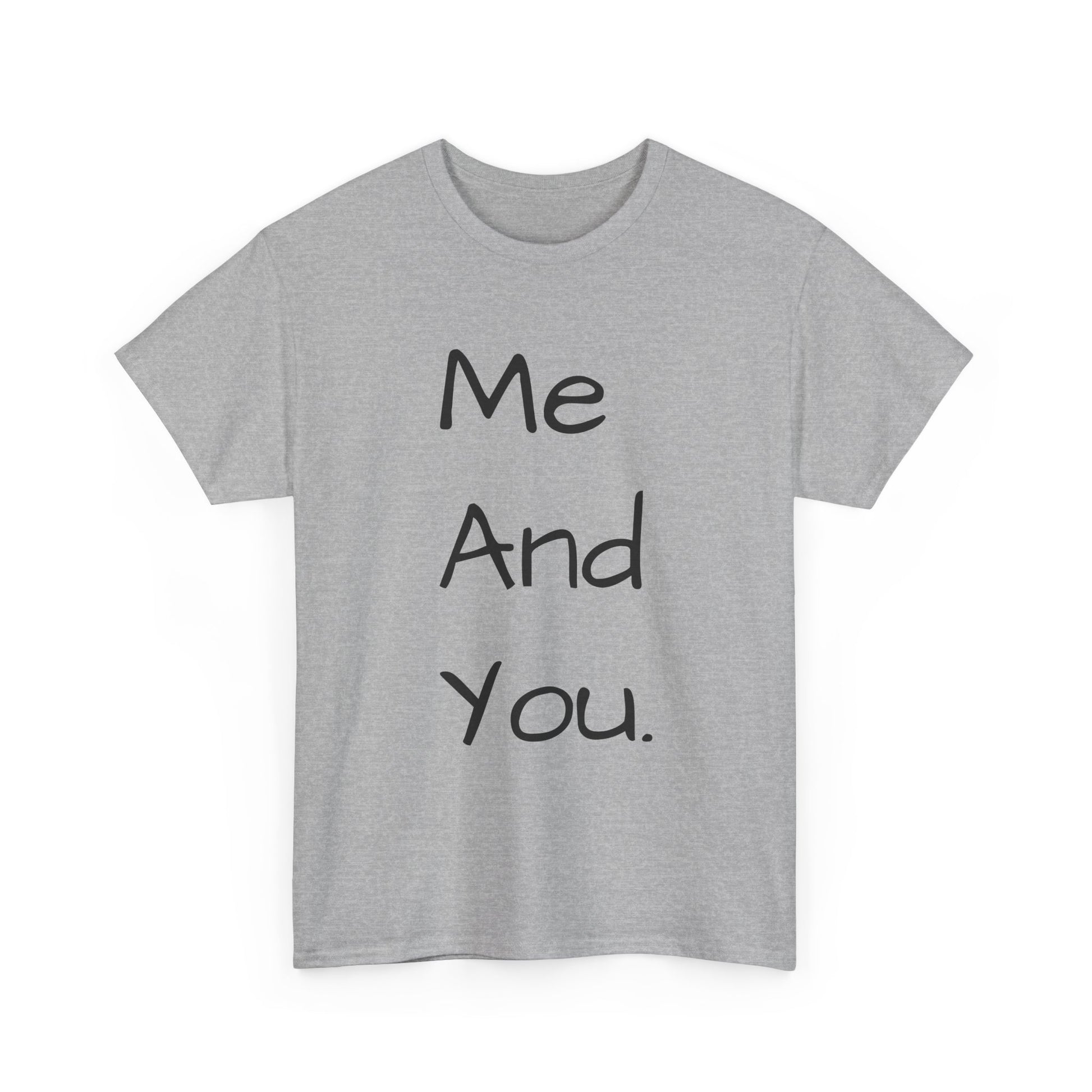 A soft, classic cotton tee with a quiet, handwritten message down the front: “Me And You.” The simple vertical text reads like a personal note, carrying warmth without shouting. Wear it on slow mornings with coffee and a partner, on casual date nights, or while wandering familiar streets. The light fabric and relaxed crew neckline sit comfortably—this is a shirt that settles into everyday life and keeps the focus on connection rather than flash. The subtle natural texture in lighter tones and clean white background make the words feel intimate and honest, a small wearable reminder of companionship.